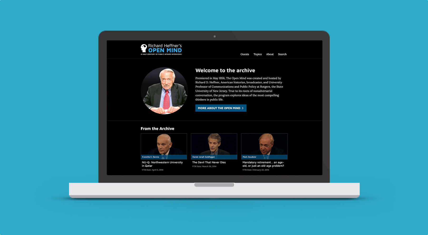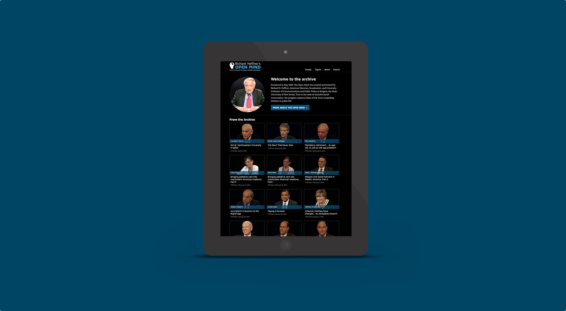 The Open Mind and The Open Mind Archive were originally sourced from the same database of over 1500 different episode posts. The client wanted to separate these projects into an archive of the work of Richard Heffner as well as a site for the current show, hosted by Alexander Heffner. The archive featured advanced sorting tools powered by AJAX and jQuery for sorting by guest or topic, as well as Google Custom Search for more complex queries. The current show site featured a much smaller set of episodes, and quickly ties the two iterations of the show together.